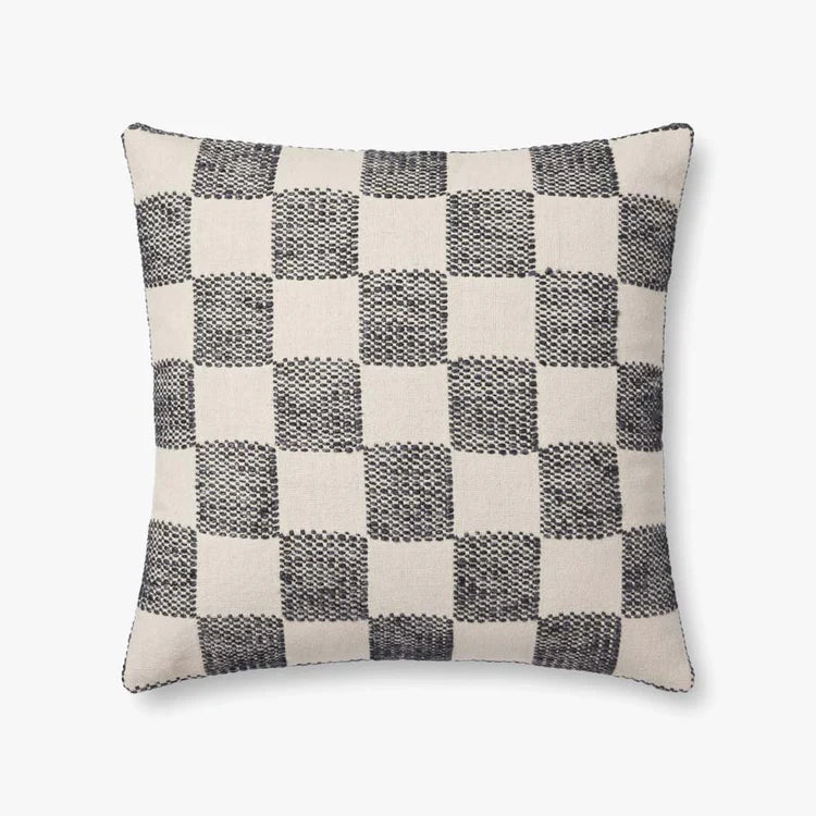 A pillow cotton pillow in a light cool neutral with a dark charcoal stitched, checkered pattern