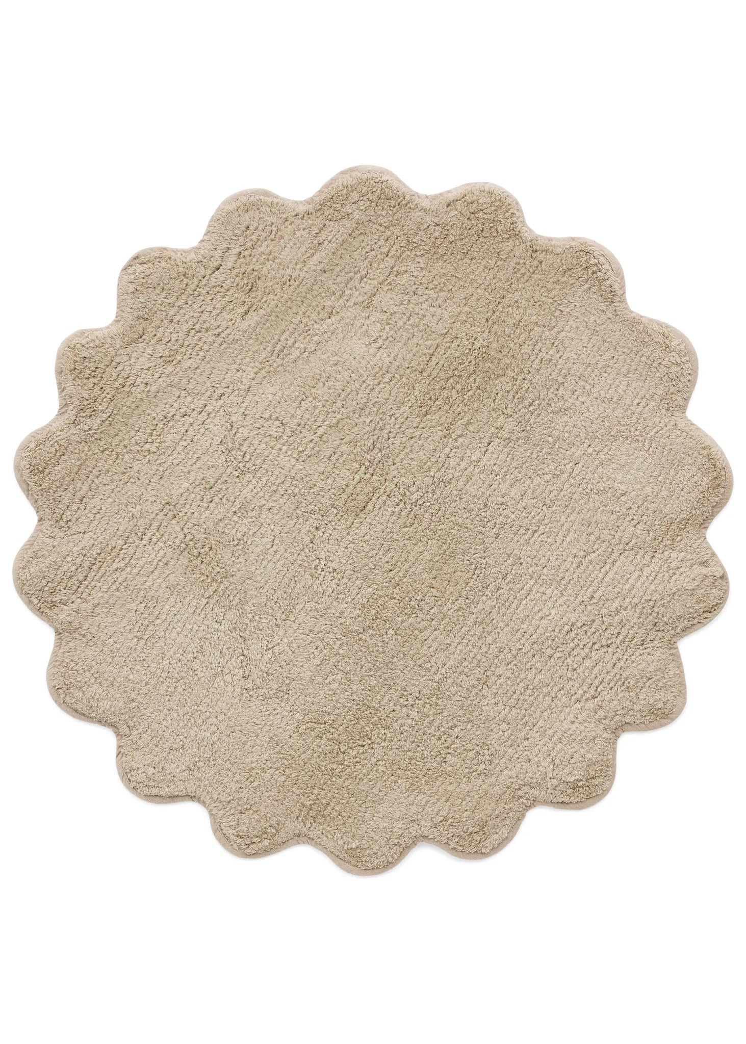 A round plush bathmat with scalloped edges in beige. 24" in diameter its perfect for a small space or to add an extra softness in any bathroom