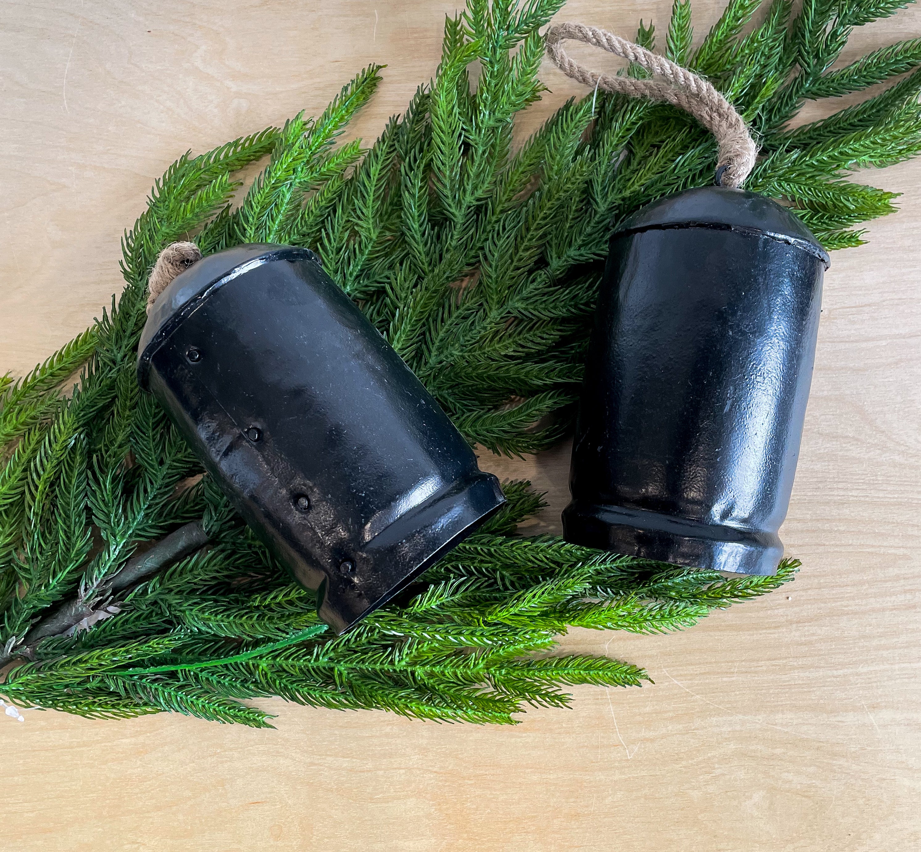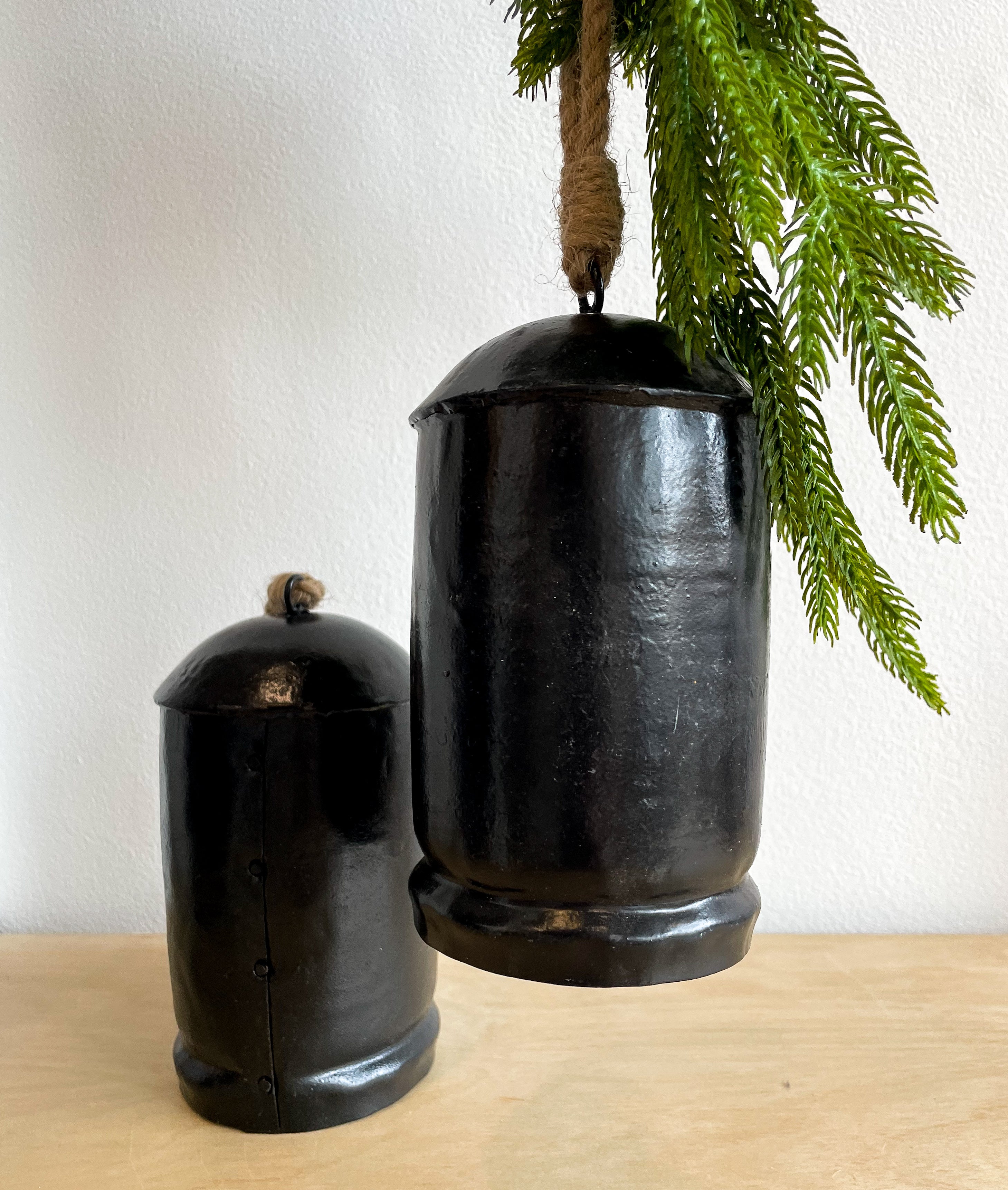 This large sized bell has an antique, handmade feel with a black finish and twine rope.