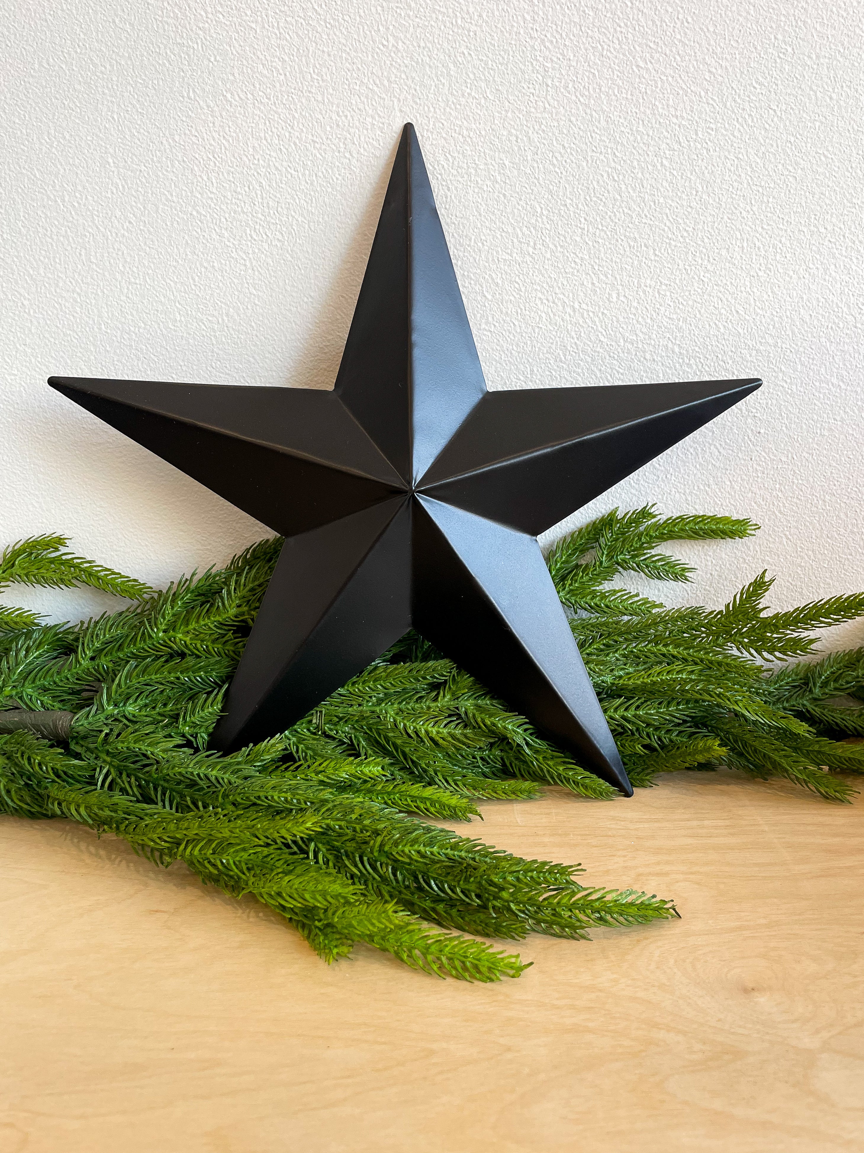 This over sized iron star is finished in a matte black. Perfect for hanging or on the tree.