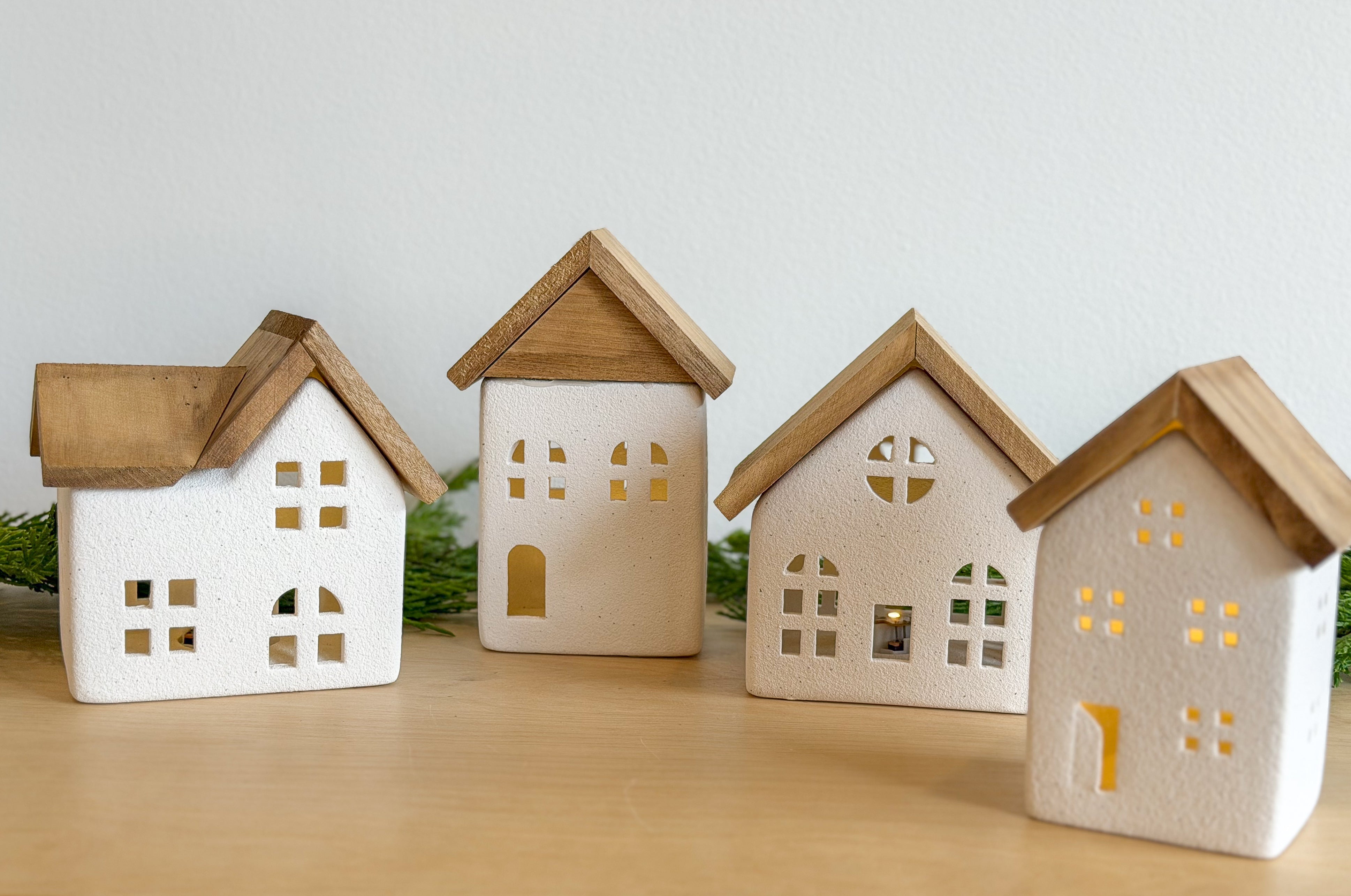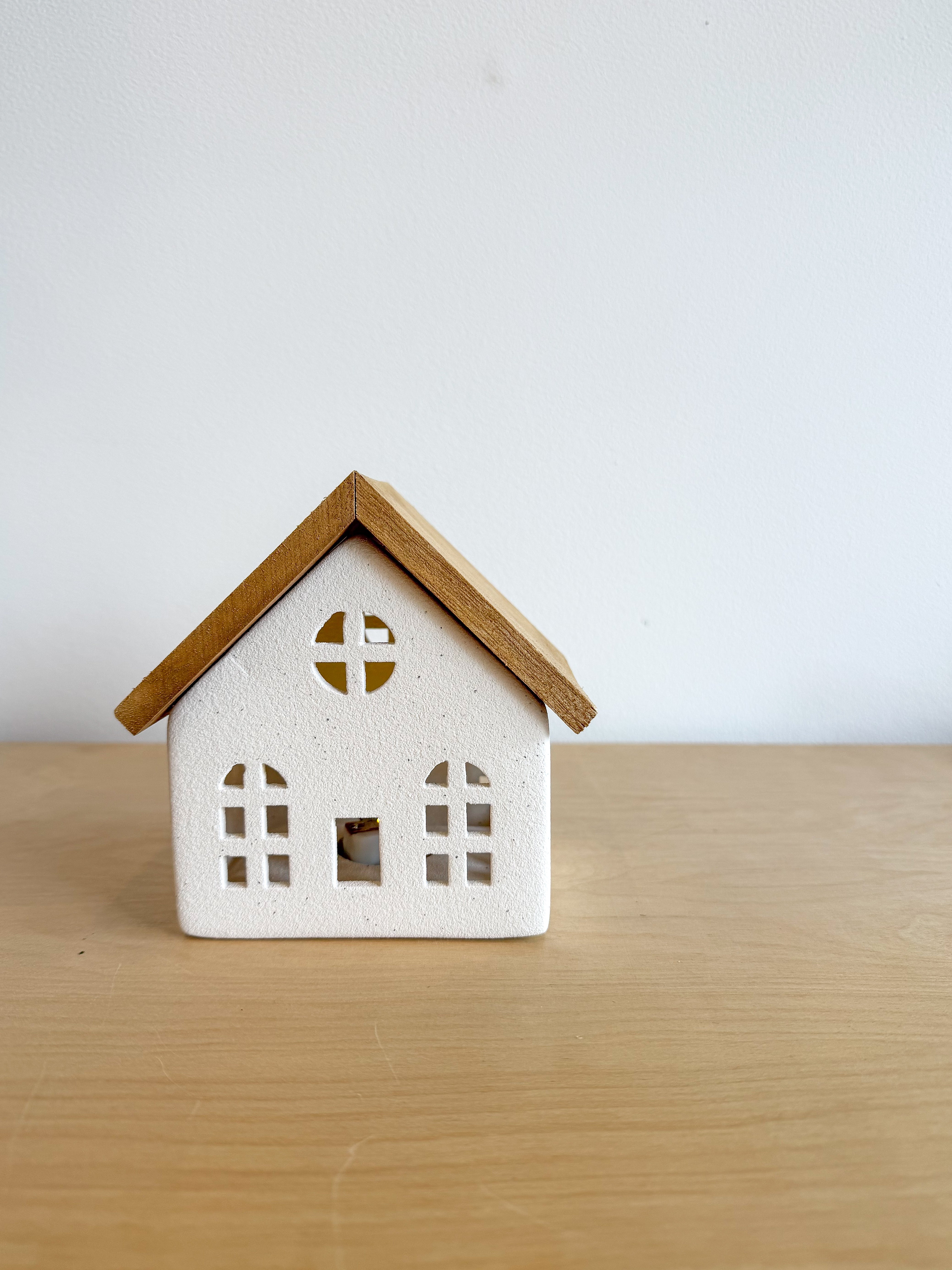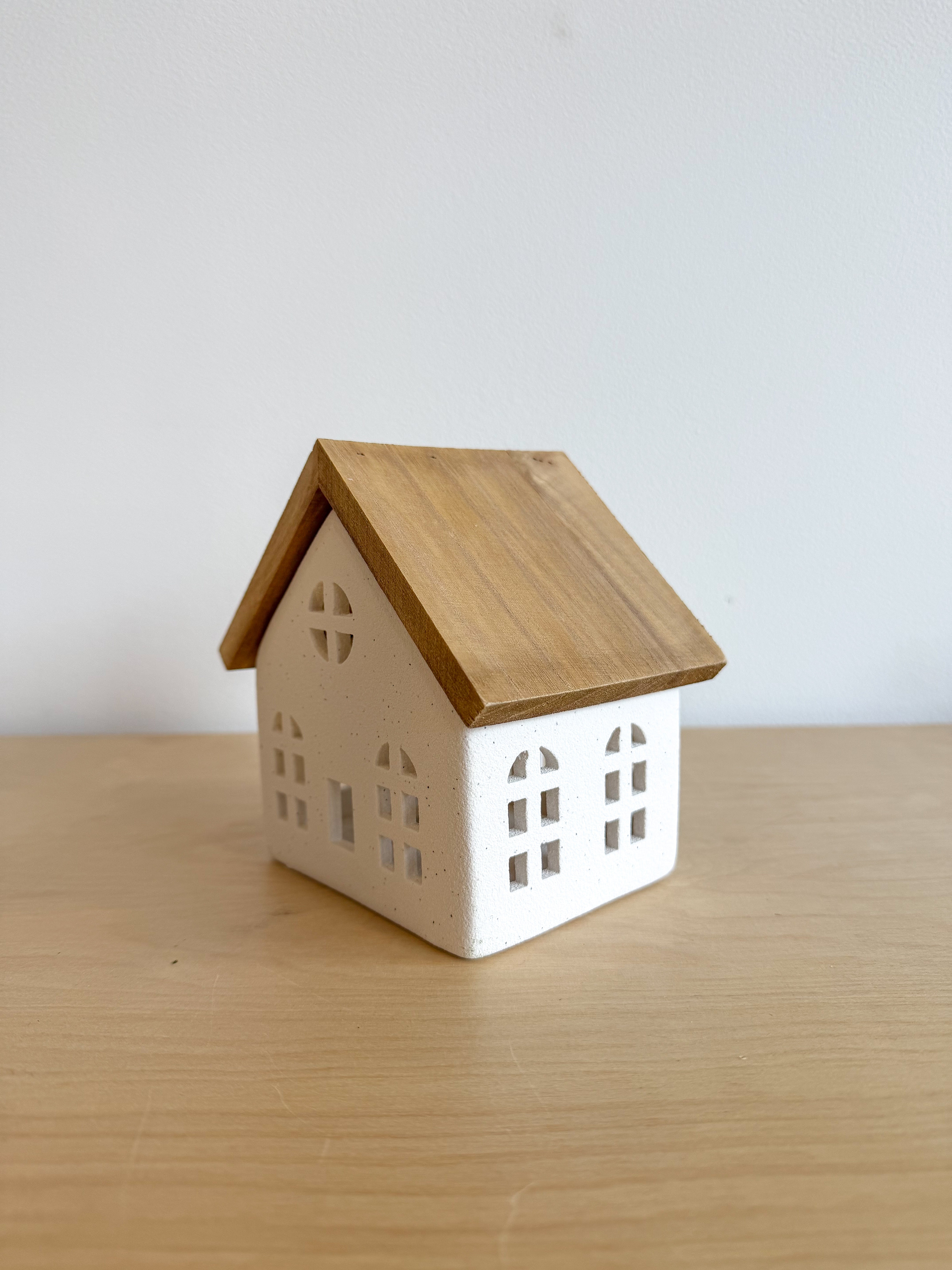 A ceramic decorative house with wood roof and LED light inside which creates a warm glow. Nestle on a tablescape, within your greenery on a mantle or a sideboard.