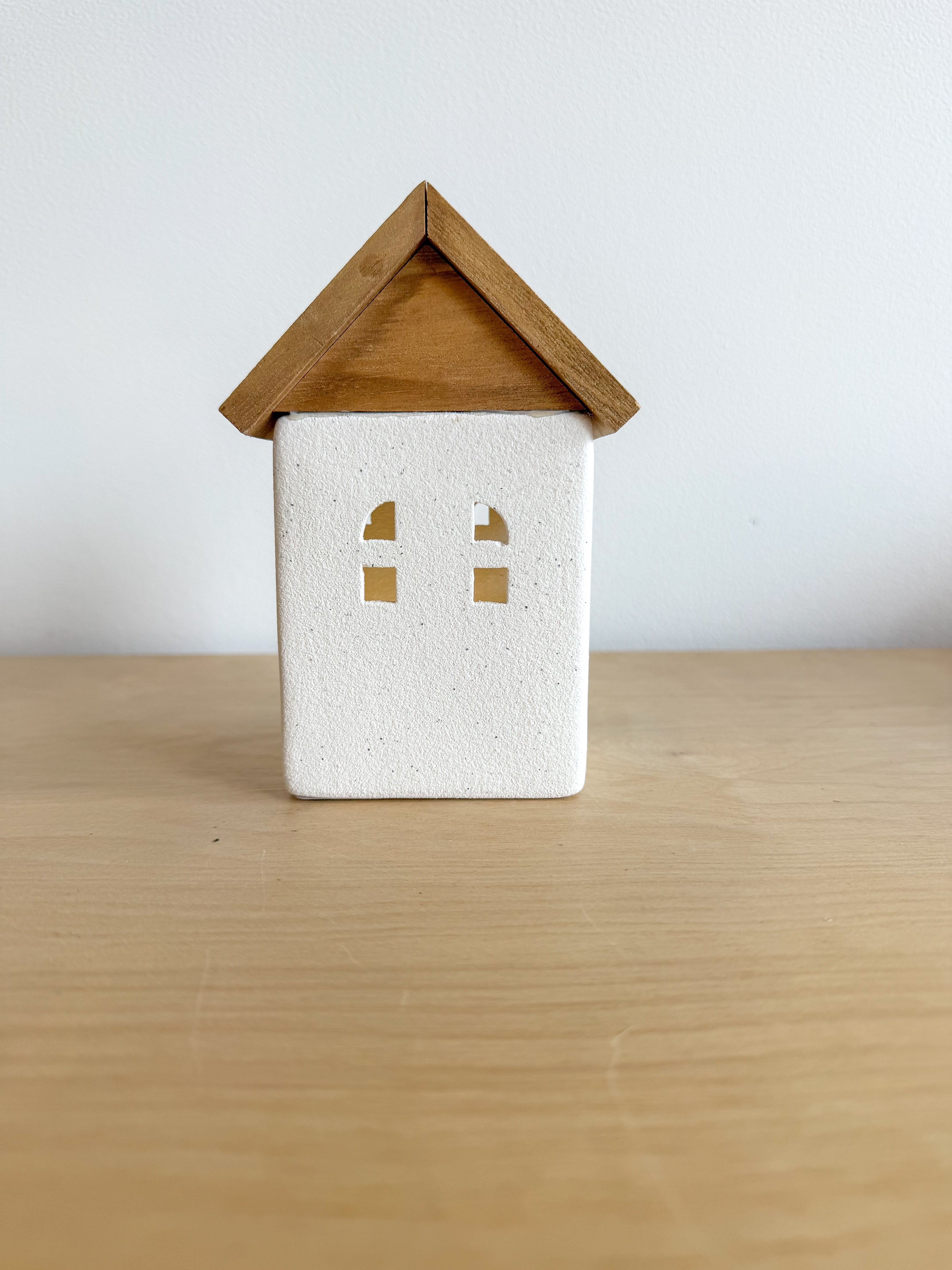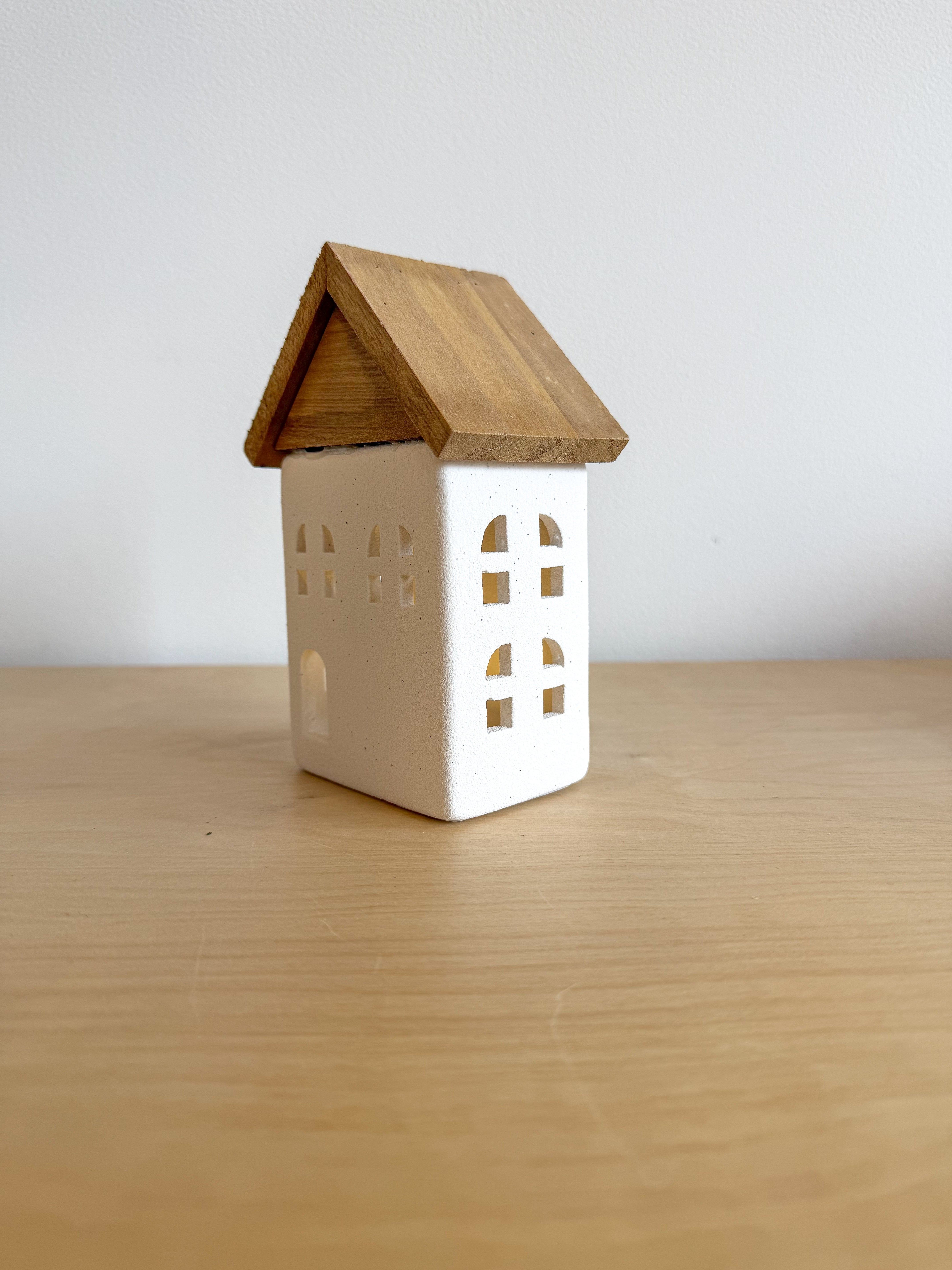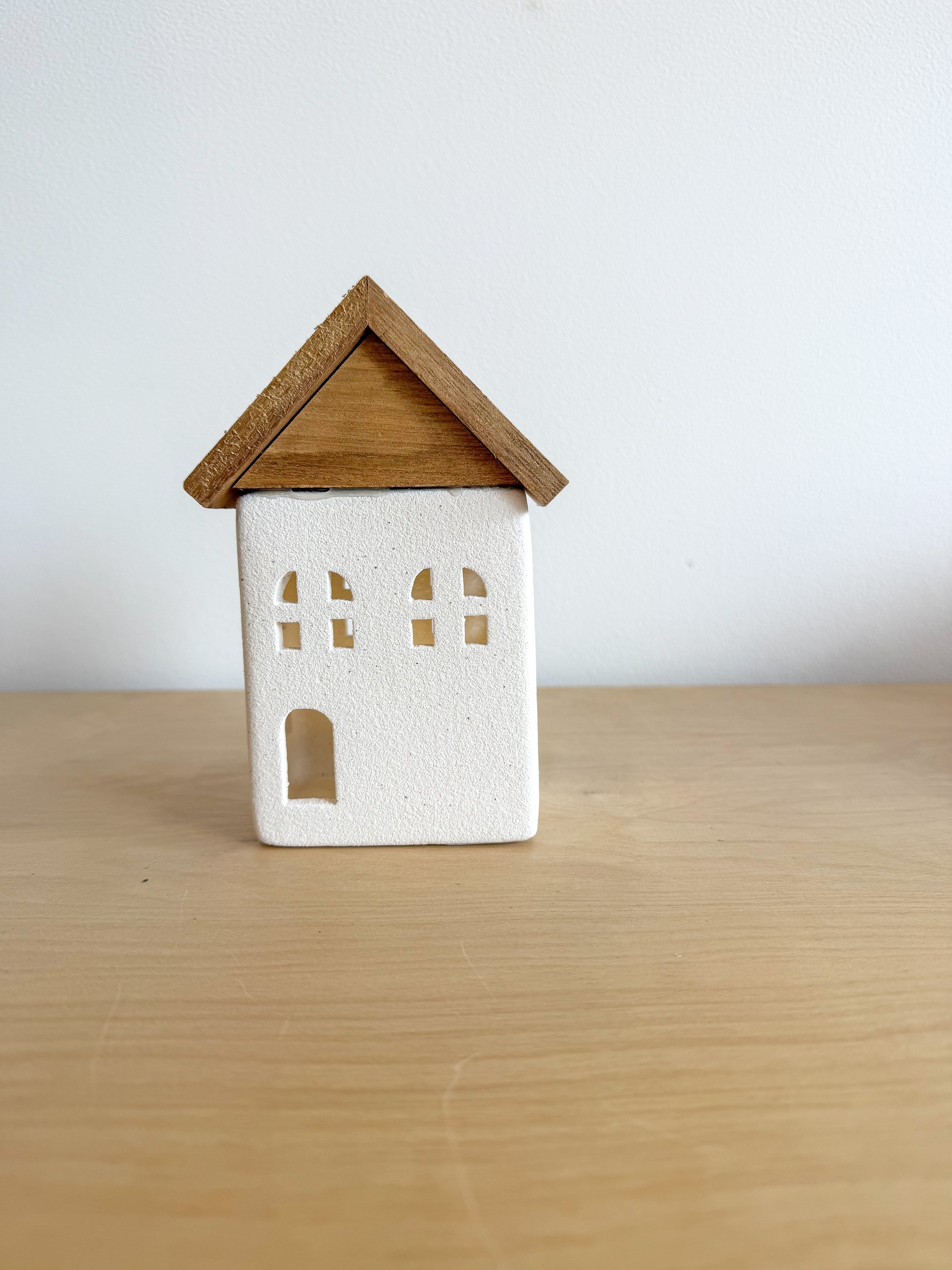 A ceramic decorative house with wood roof and LED light inside which creates a warm glow. Nestle on a tablescape, within your greenery on a mantle or a sideboard.