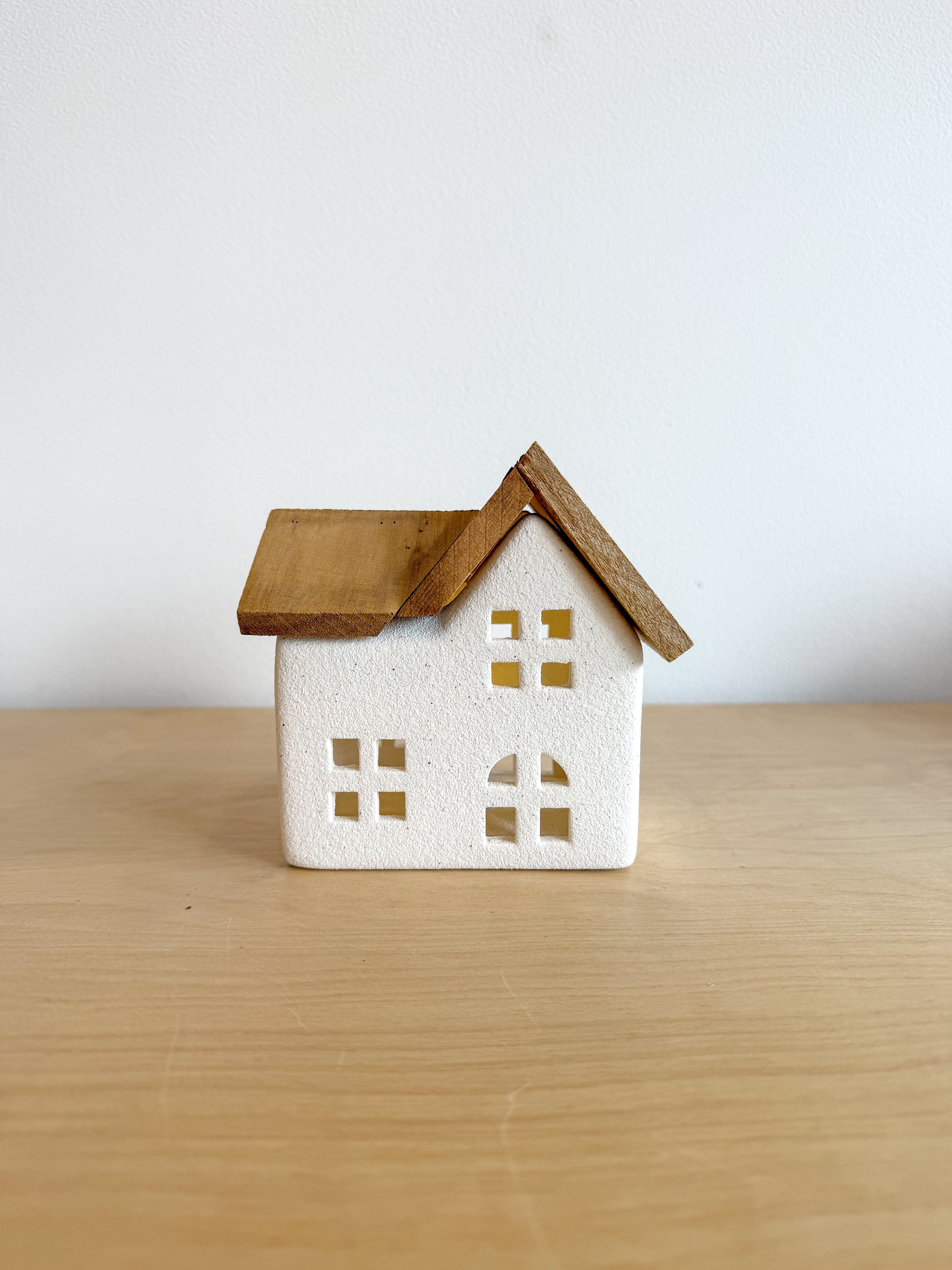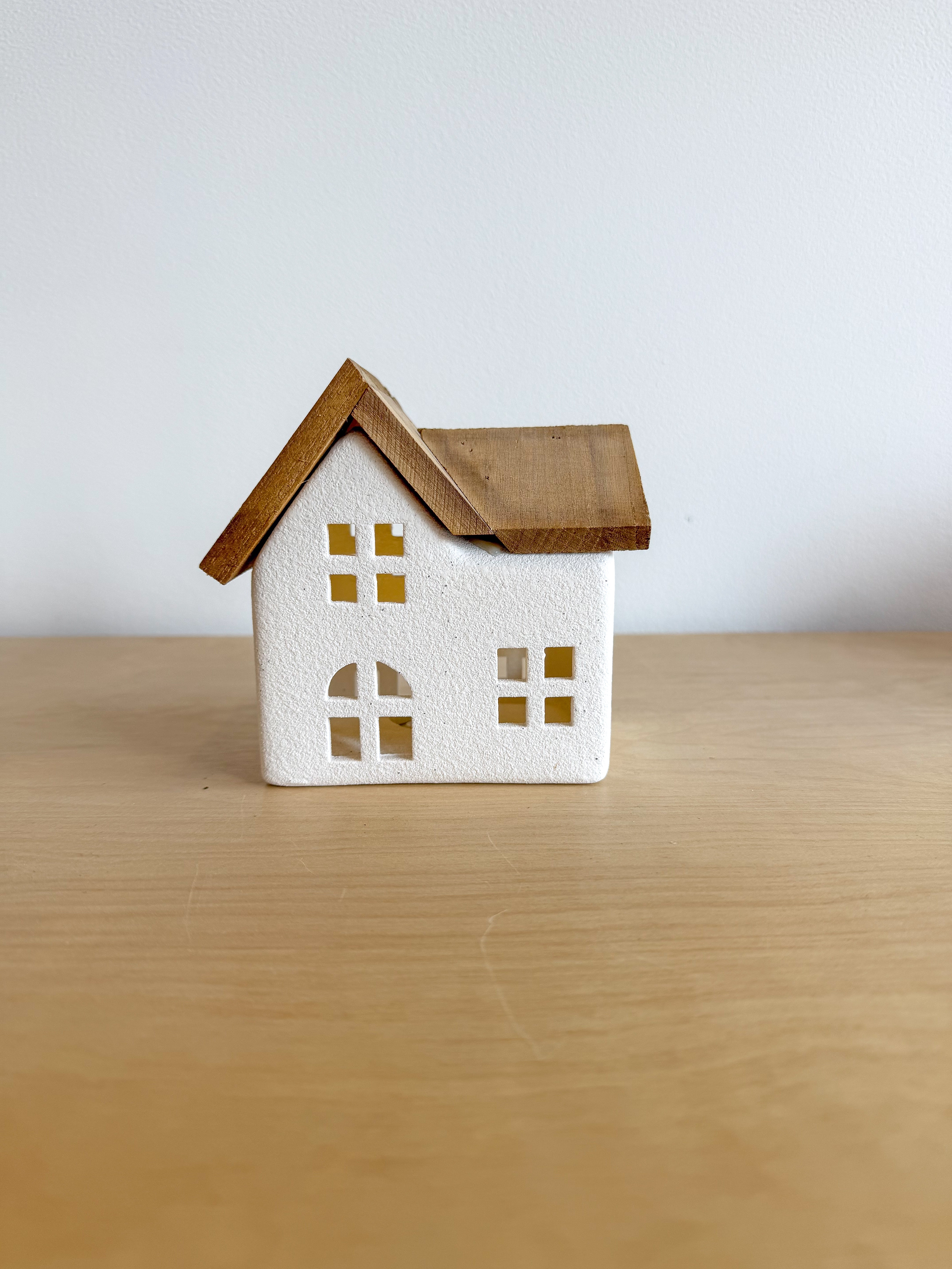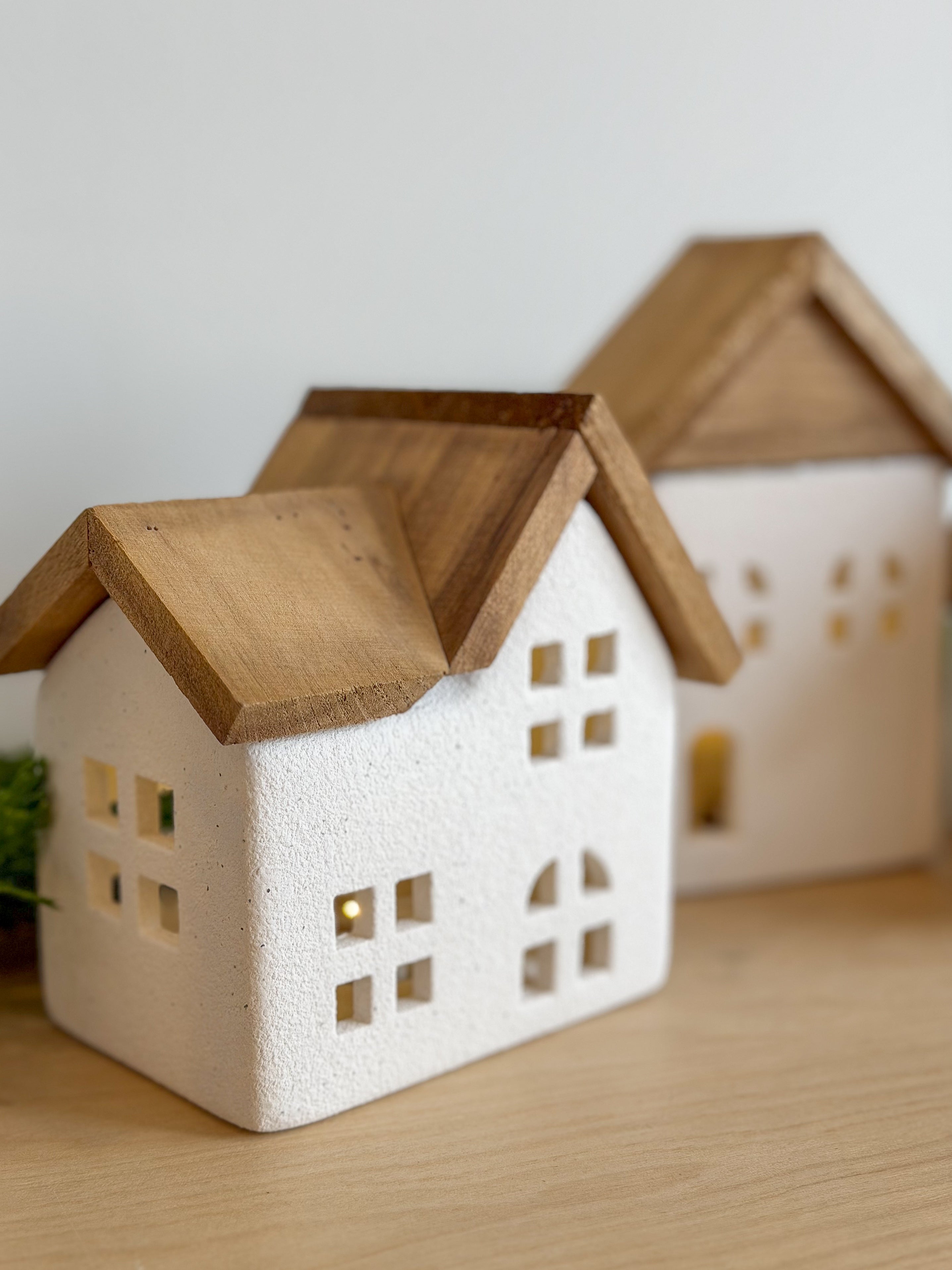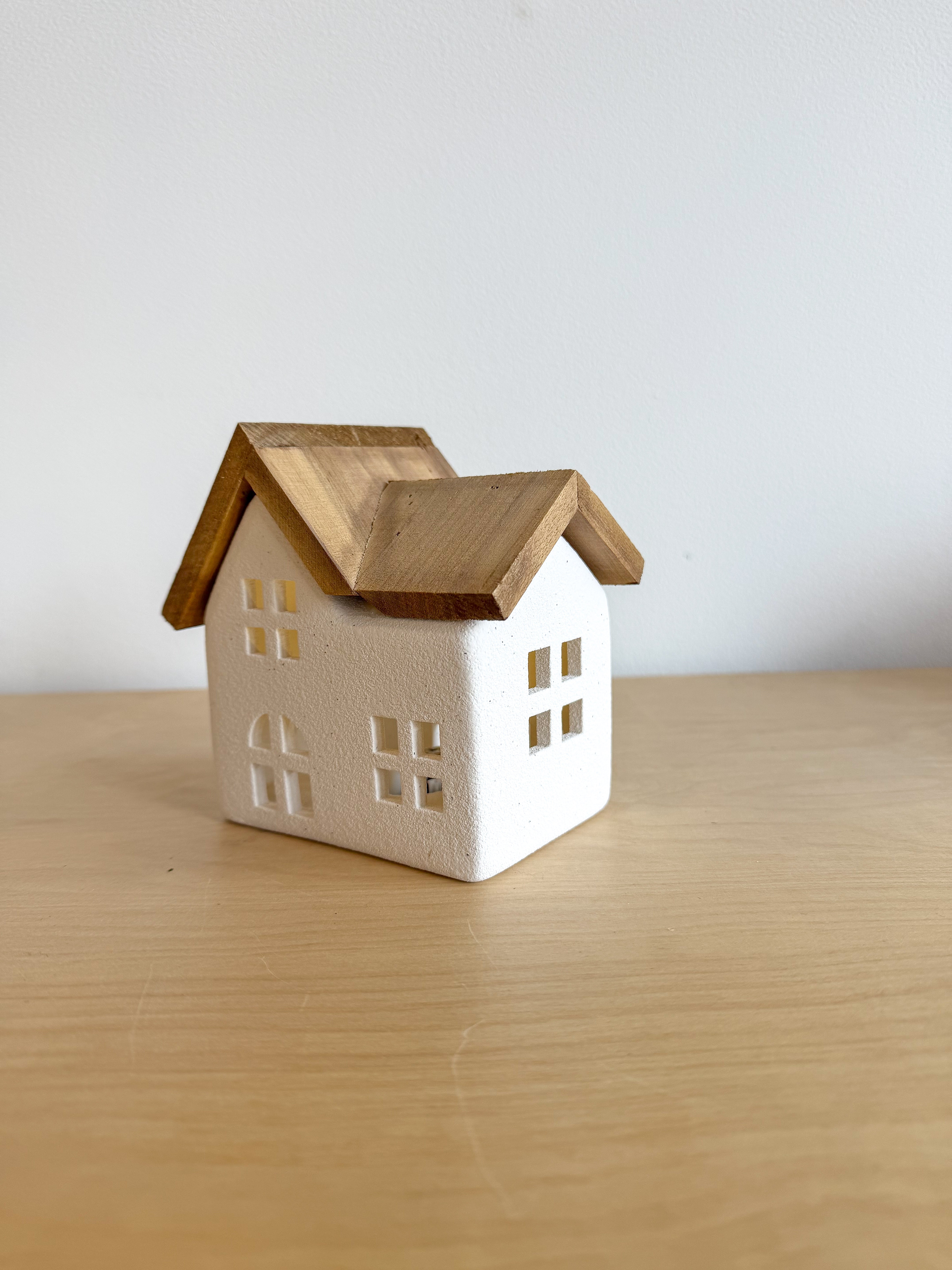 A ceramic decorative house with wood roof and LED light inside which creates a warm glow.  Nestle on a tablescape, within your greenery on a mantle or a sideboard.