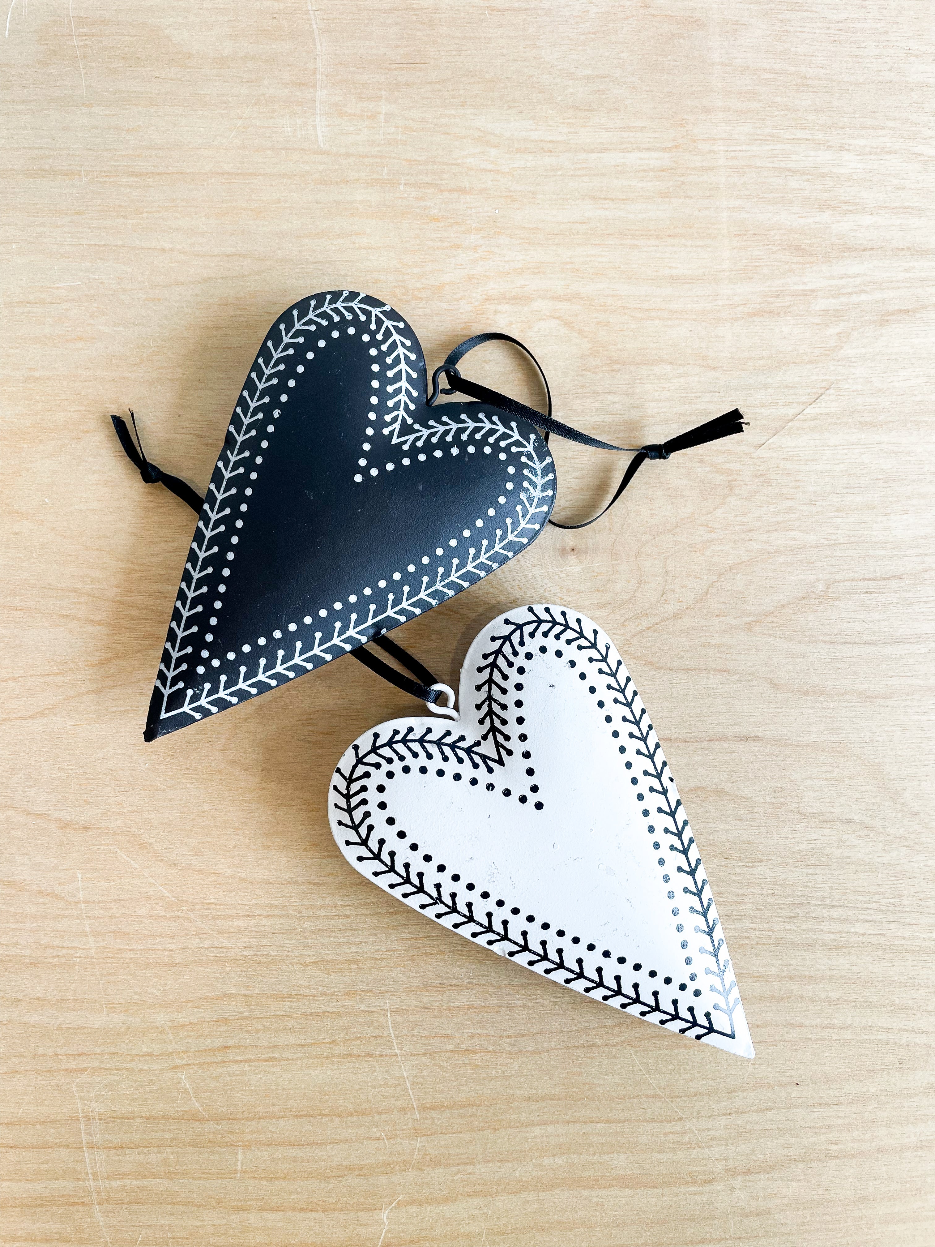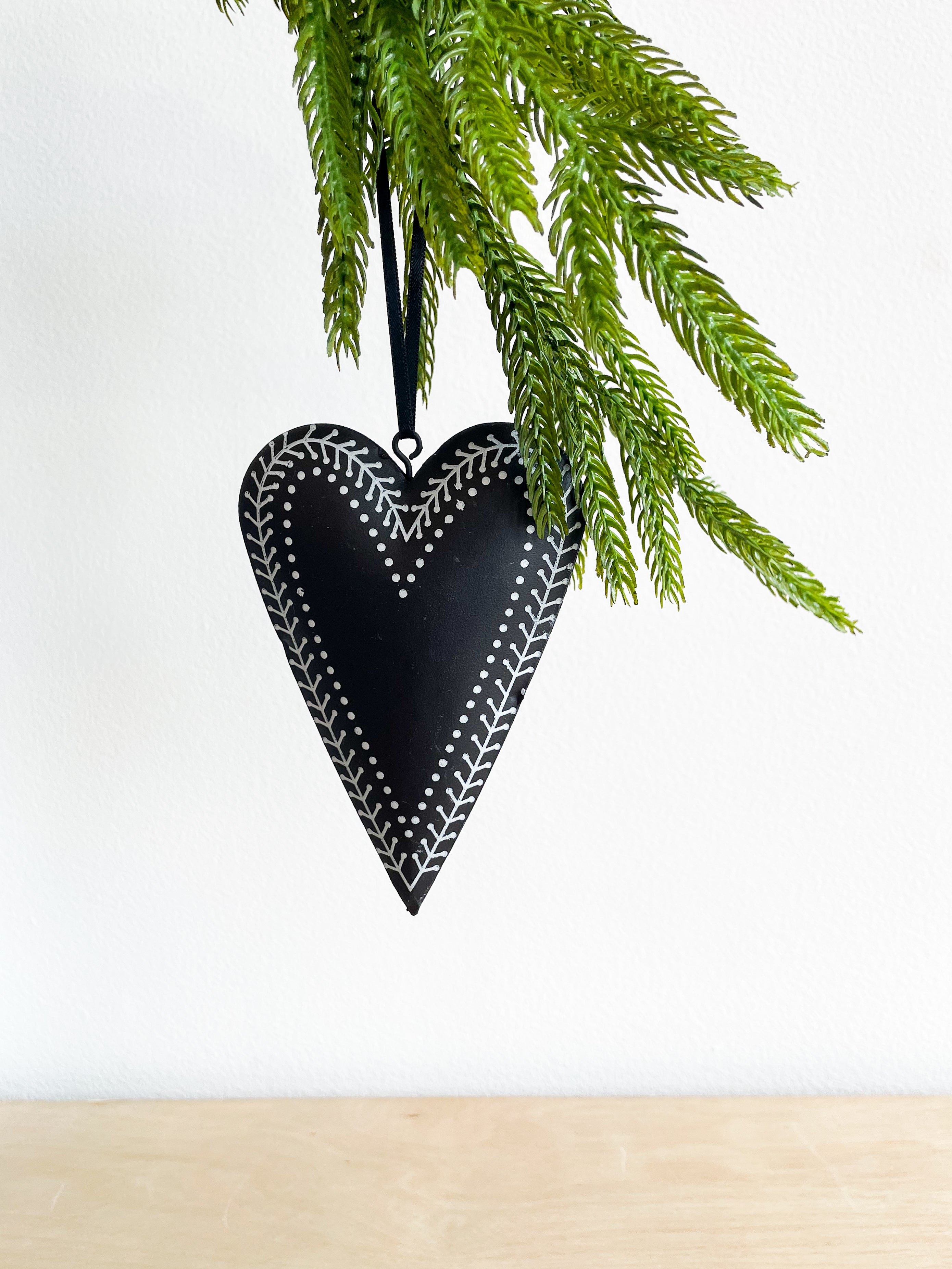 This iron heart is finished in a matte black with a white decorative detail on a black ribbon