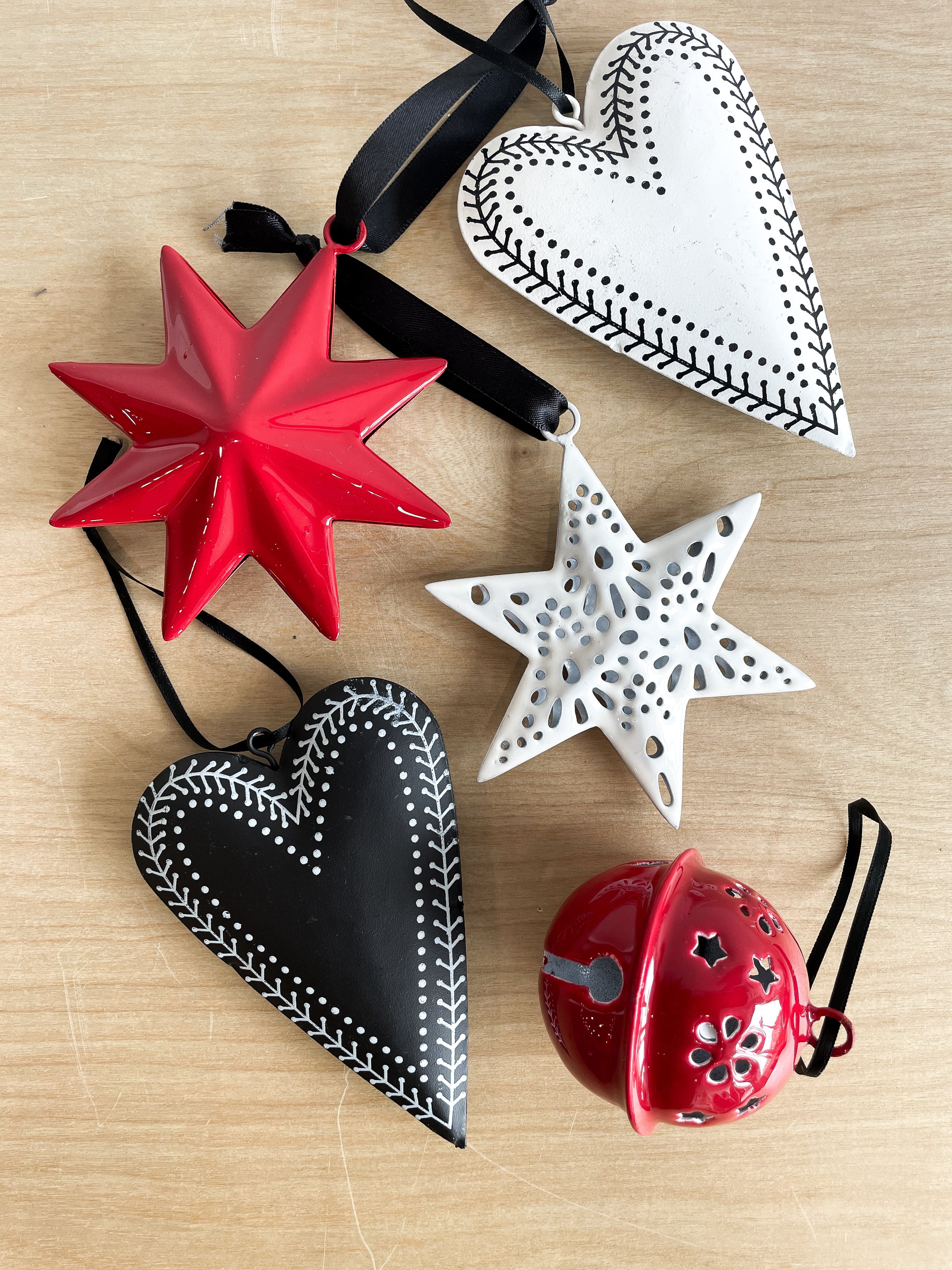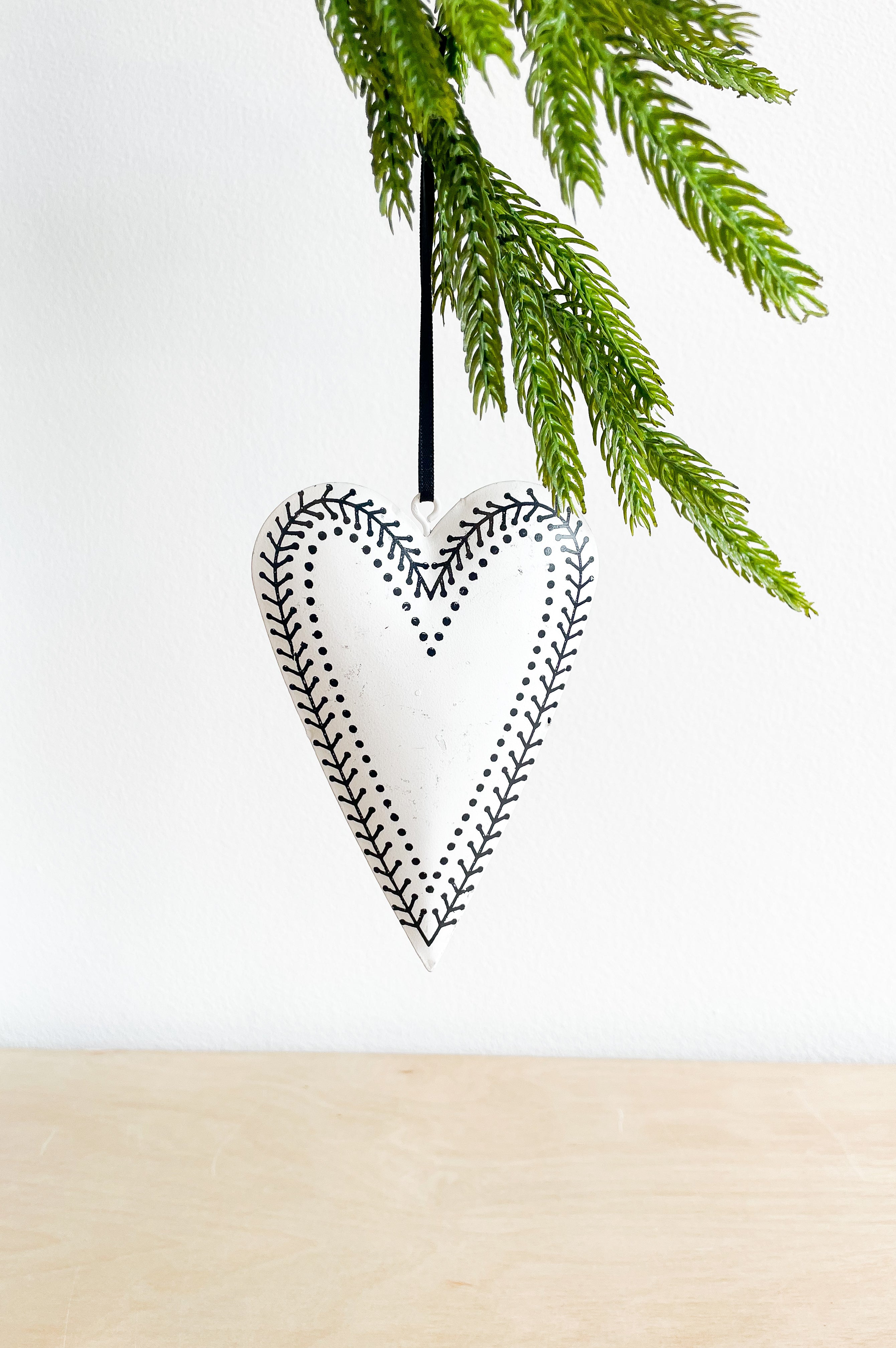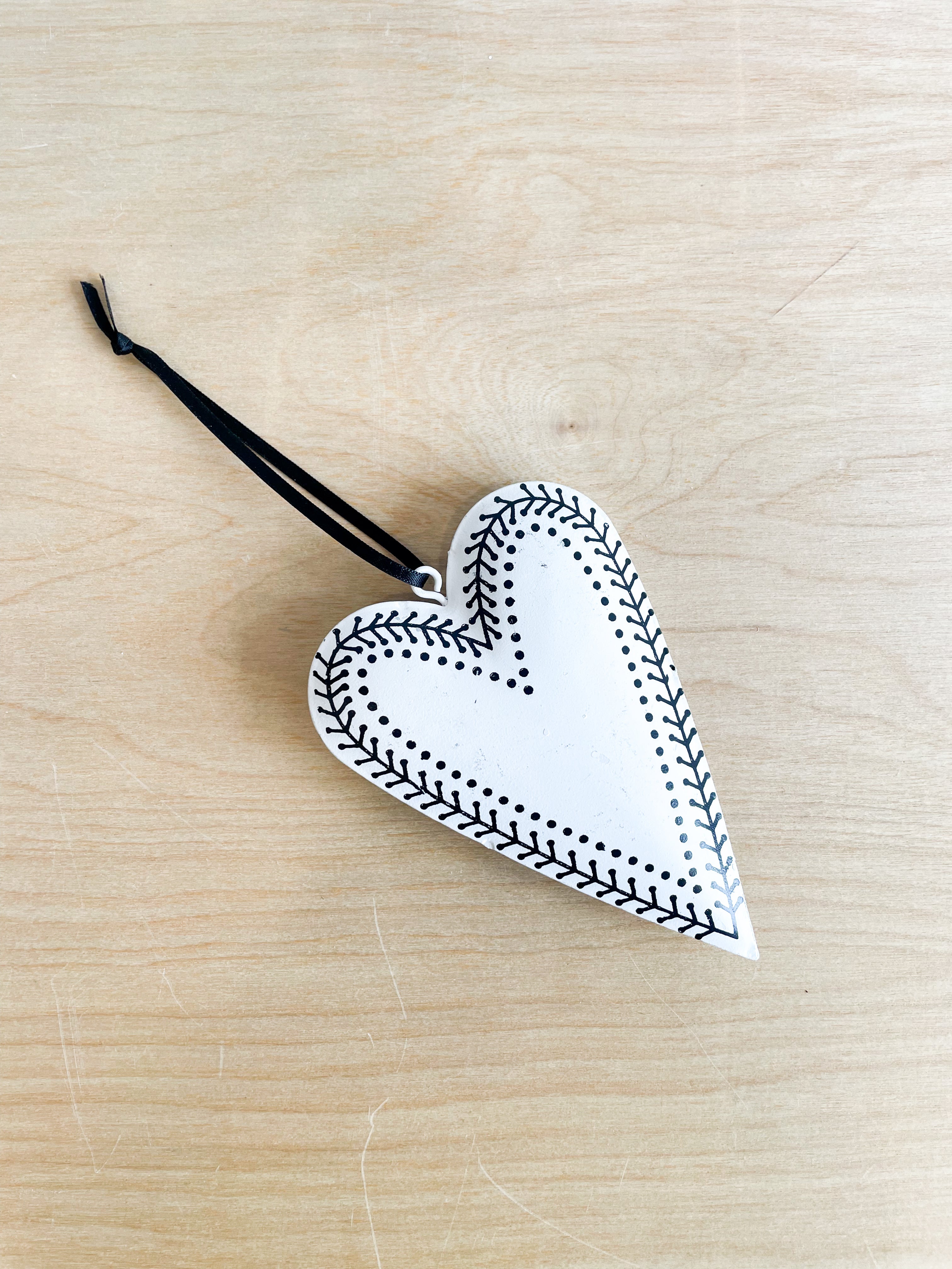 This iron heart is finished in a matte white with a black decorative detail on a black ribbon