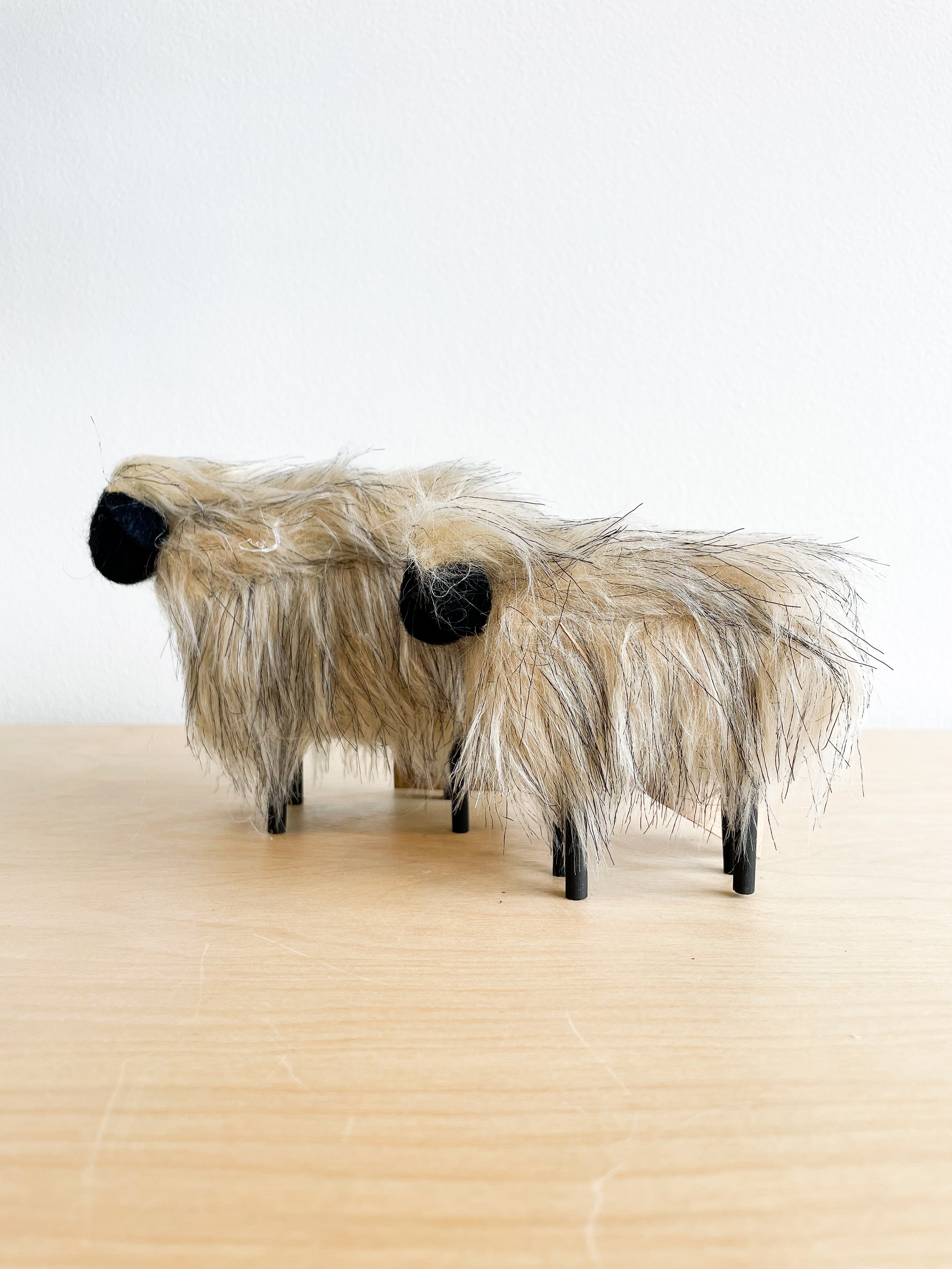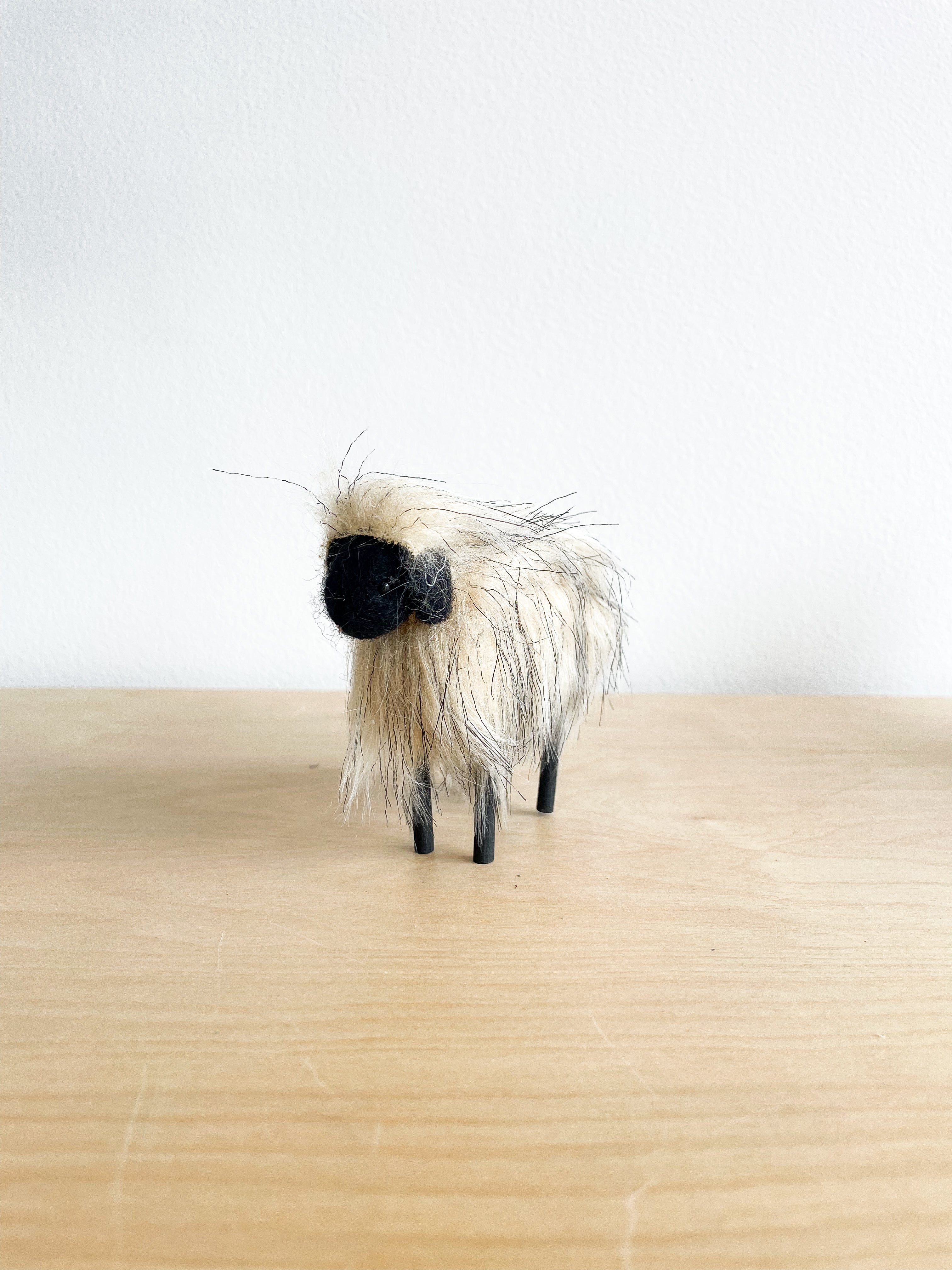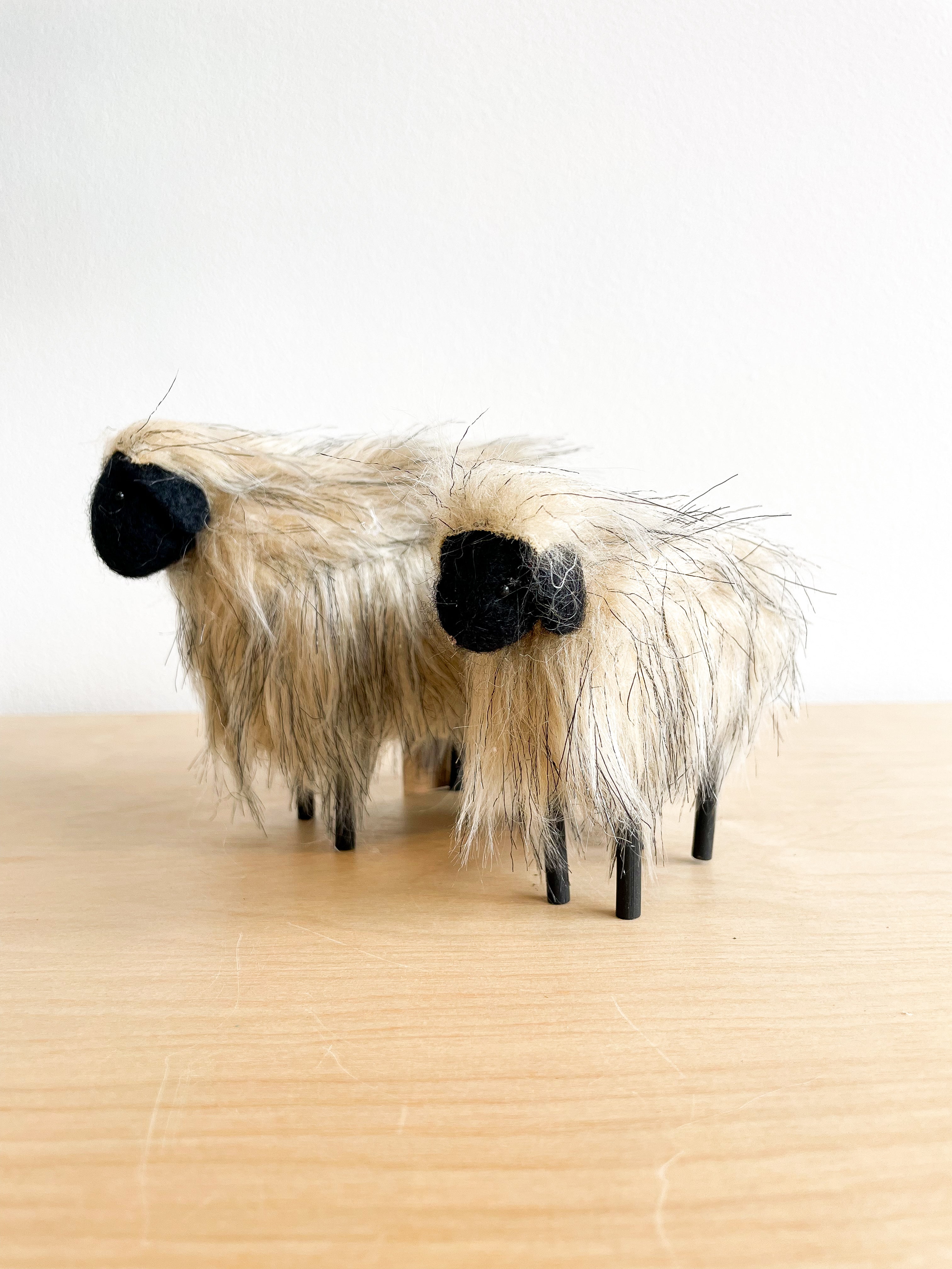 Adorable holiday sheep with a long, light brown coat and black face with little ears.