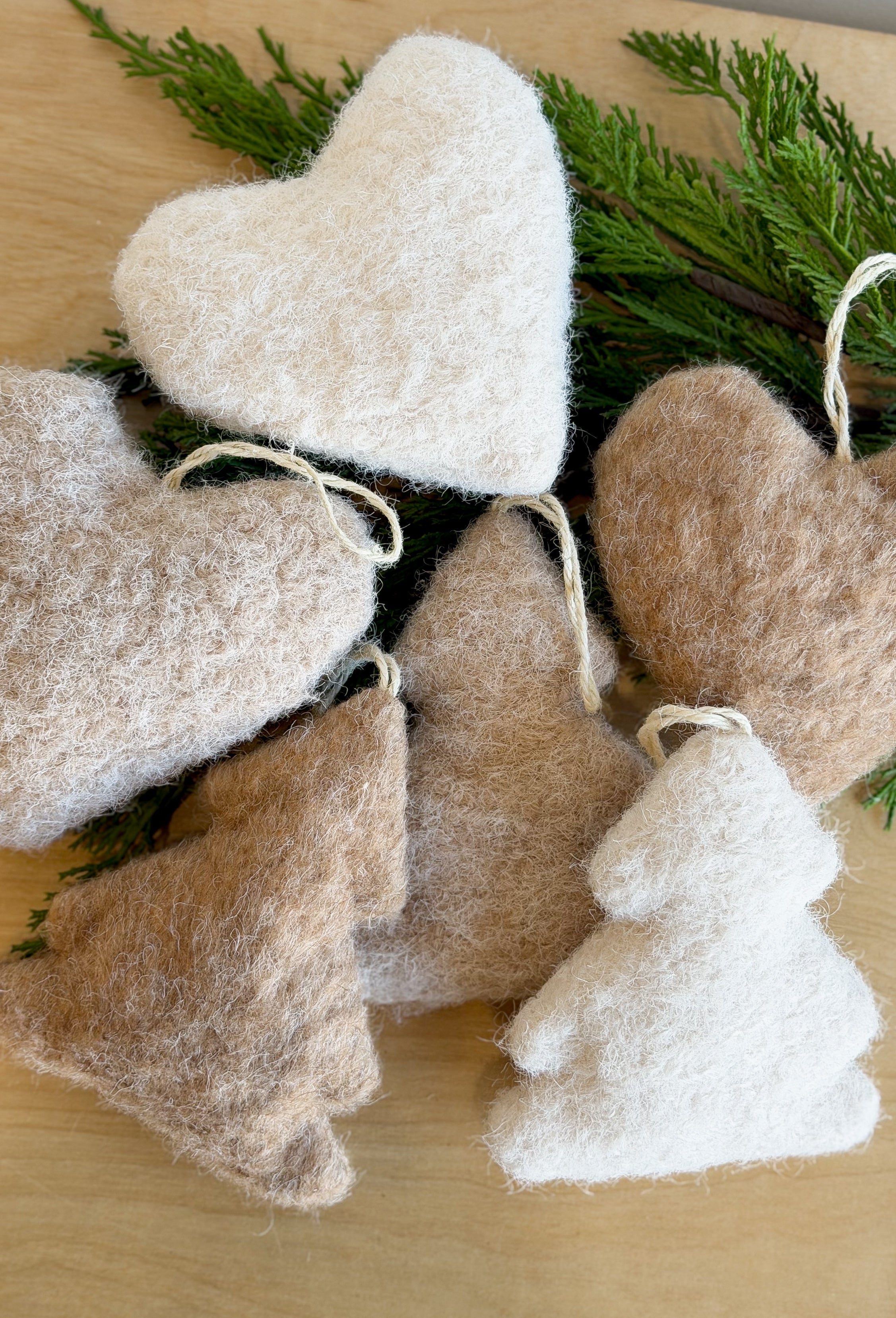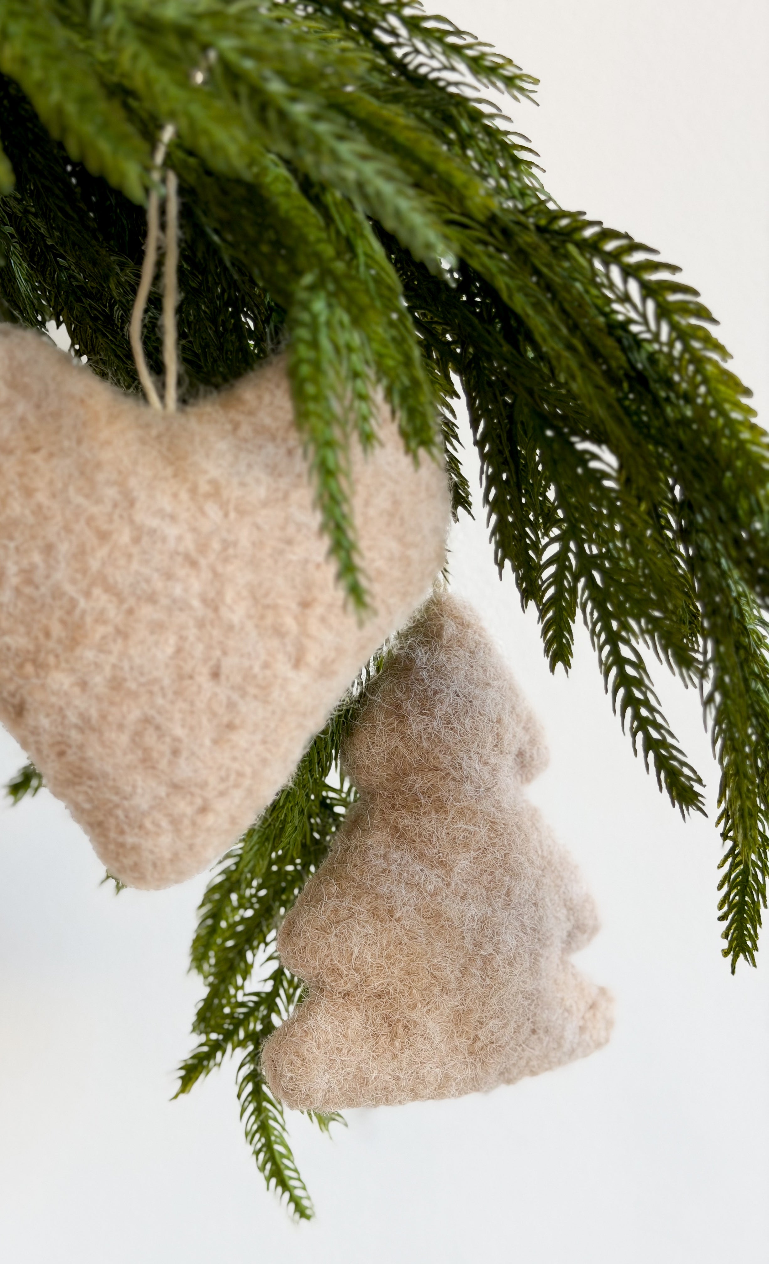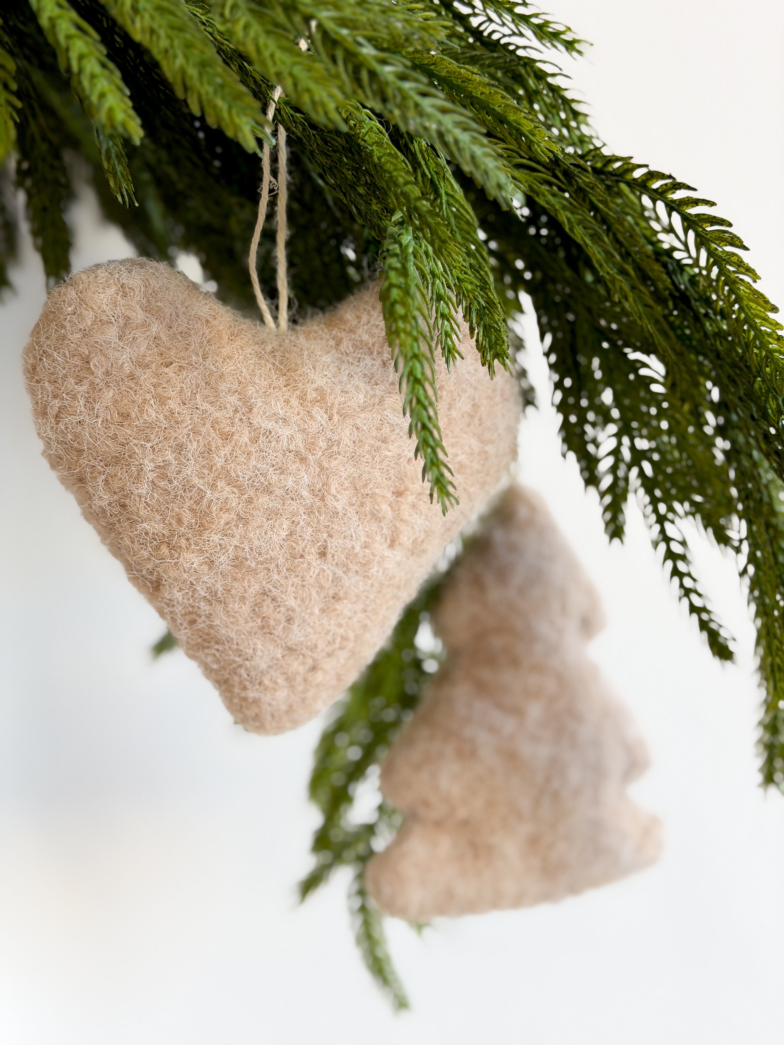A set of two fabric tree ornaments, with a felted wool look in soft brown. A heart and tree shape, perfect stuffed.