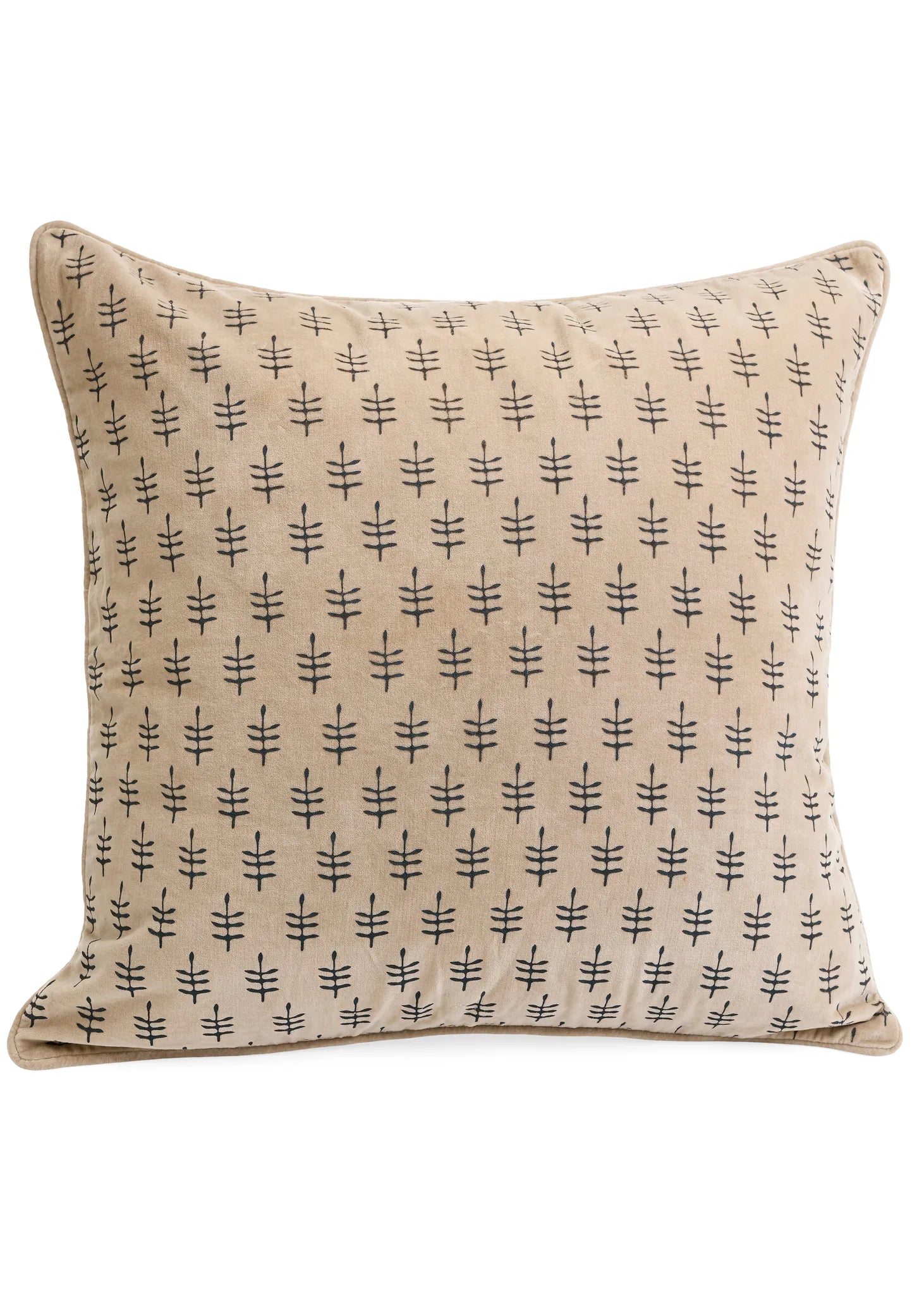 A patterned velvet pillow in a soft taupe grey with an abstract sheaf motif in dark charcoal. Insert included.
